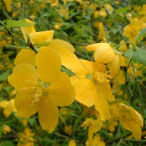 Листовая пластина во многом напоминает лист малины. Длина 8-10 см, по форме ланцетные, зубчатые по краям и сужающиеся к концу. Верхняя сторона листовой пластины гладкая на ощупь, снизу на ней присутствуют небольшие ворсинки. Черешок голый длиной 5-15 мм. Летом листва керрии светлая, бледно-зеленая, а осенью кустарник преображается – листья приобретают насыщенный желтый оттенок.