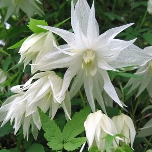 Листья сложные, тройчатые, среднего размера, насыщенно-зеленые. Декоративность сохраняется весь сезон. Княжик начинает цвести на 2–3 год. Цветение приходится на май–июнь и длится около 3–4 недель, возможное повторное цветение. Цветки поникающие, колокольчатые, диаметром 5–7 см. Окрас чисто-белый. Главная особенность — густомахровая структура, создающая эффект объемных воздушных шаров. Аромат слабый.