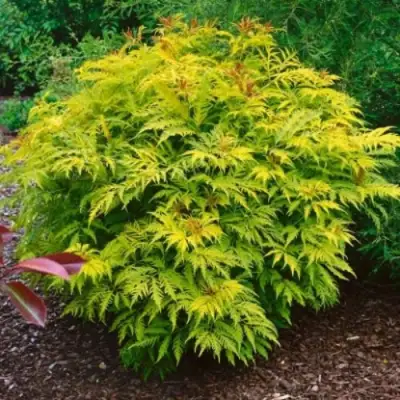 Красная бузина Сатерлэнд Голд – эффектный декоративный кустарник, который станет ярким акцентом вашего сада. Этот сорт отличается необычной золотистой листвой: молодые листья медно-красные, со временем переходят в насыщенный лимонно-золотой оттенок. Глубоко рассечённые, ажурные листья создают лёгкую и воздушную крону, благодаря чему бузина Сатерлэнд Голд гармонично смотрится как в одиночной посадке, так и в групповых композициях.