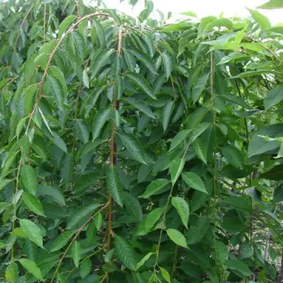 Черешня Пендула – медленнорастущее дерево с широкой зонтиковидной кроной и ниспадающими кончиками ветвей. Несмотря на свою компактность (высота дерева составляет всего от 1,5 до 2,5 метров), Пендула впечатляет своей раскидистой шириной, достигающей 3-4 метров. Это делает её идеальным растением для создания тенистых уголков в саду или для украшения газонов и цветников.Предпочитает солнечные места, но прекрасно адаптируется и к полутени. Это дерево не только красиво, но и нетребовательно, что делает его идеальным выбором для начинающих садоводов. Листья черешни Пендула глянцевые, зеленые, вытянутой яйцевидной формы. На протяжении всего лета они остаются зелеными, а осенью приобретают насыщенные желтые оттенки.