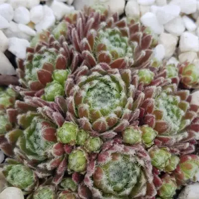Цветение — один раз в жизни розетки, в середине лета. На высоком цветоносе (до 15 см) раскрываются мелкие звёздчатые цветки с розово-кремовыми лепестками. Цветение завершает жизненный цикл розетки, но оставшиеся дочерние растения быстро занимают её место, поддерживая плотность посадки.