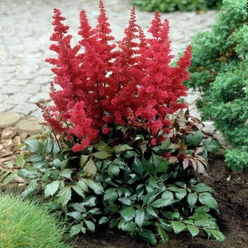 Астильба Монтгомери — это не просто многолетник, а полноценный инструмент для создания выразительных теневых композиций. Её насыщенный цвет выгодно контрастирует с хостами, папоротниками и гейхерами, а также подчеркивает глубину теневых участков.