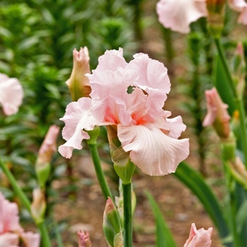 Пинк Хорайзон — это высокодекоративный ирис с цветоносами до 80–90 см. Цветки крупные, с правильной формой, раскрываются широким веером, занимая значительное пространство в верхнем ярусе цветника. Лепестки формируют аккуратную архитектуру: верхние (“стандарты”) нежно-розовые, с едва уловимым персиковым отливом, нижние (“фолы”) более насыщенные, кораллово-розовые, плавно уходящие в теплую гамму. Центральная бородка контрастная — ярко-розовая, что усиливает глубину цветка. Цветение стартует в конце мая и длится 2–3 недели.