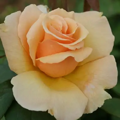 Роза Медальон — эффектный чайно-гибридный сорт, который ценят за мощный рост, выразительный цвет и стабильное повторное цветение. Абрикосовые лепестки раскрываются в крупную чашу с мягким золотистым оттенком, плавно переходящим в светлый край. Цветок выглядит насыщенно даже в пасмурный день, а в солнечную погоду будто светится изнутри — редкое сочетание для роз с тёплой палитрой.