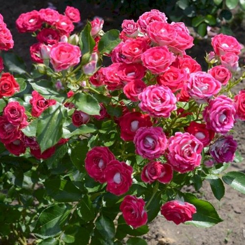 Главное достоинство сорта — яркое, стабильное цветение. Бутоны среднего размера (около 5 см) распускаются в насыщенные малиново-красные цветки с кремовой изнанкой лепестков. Цветки махровые (до 30 лепестков), собраны в кисти по 5–8 бутонов. Цветение обильное и длительное — с начала июня до заморозков. Цветы не теряют форму от дождя, не выгорают на солнце, сохраняют декоративность в течение нескольких дней. Аромат — лёгкий, мягкий, ненавязчивый.