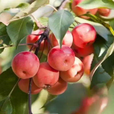 Мелкие плоды легкие и достигают не более 2 см в диаметре. Цвет очень разнообразен: варьируется от светло-оранжевого до насыщенного красного. Яблочки держатся на длинной плодоножке. Малый их вес способствует длительному пребыванию урожая на ветвях.