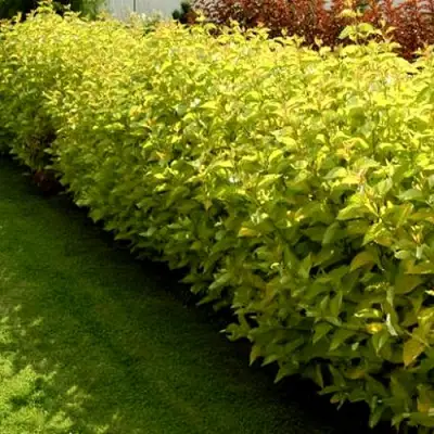 Если вы хотите сделать на своем участке оригинальную живую изгородь, тогда вам нужно выбирать пузыреплодник. У него очень декоративный вид. Пузыреплодник Дартс Голд – компактное до 1,5-2м в высоту. Листья более яркие лимонно-желтые летом и оранжевые осенью. В начале лета появляются бело-розовые цветы, плоды созревают к сентябрю. Почему для живой изгороди необходимо выбрать именно пузыреплодник: